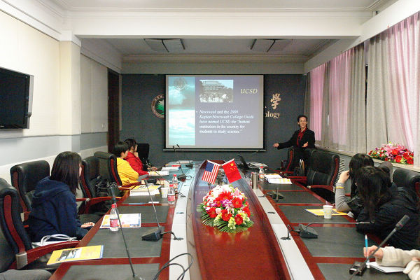 2008年11月6日,加州大學圣地亞哥分校的Roxanne女士和Etran Chane女士訪問我校,與我校教務處和國際交流合作處的老師討論了我校本科生訪學項目的相關事宜,并給學生介紹了到加州大學圣地亞哥分校選課、聽課和參加實踐活動應注意的問題,回答了同學們的提問。