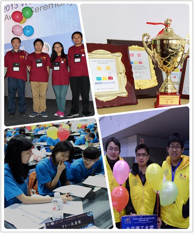近年來,北京理工大學在ACM-ICPC國際大學生程序設計競賽上取得了長足的進步,不斷刷新成績。2012年ACM-ICPC競賽亞洲區中,ACM集訓隊的兩只代表隊參賽,經過角逐,從152支優秀隊伍中脫穎而出,獲得一金一銀的好成績,此戰實現了我校近十年來躋身ACM-ICPC世界總決賽的夢想;2013年俄羅斯圣彼得堡ACM-ICPC國際大學生程序設計競賽中,集訓隊代表隊在世界頂尖的120所高校隊伍中嶄露頭角,初次參賽即獲得學校排名第27名的好成績。2013年ACM集訓隊在亞洲區比賽中獲得金獎季軍,再次刷新了我校在本項賽事中的最高紀錄,再次獲得ACM-ICPC世界總決賽的入場券。在2014年的ACM-ICPC世界總決賽中,我校獲得學校排名第45名的好成績;去年,ACM集訓隊以賽區金獎季軍的成績第三次晉級2015年ACM-ICPC世界總決賽。在這場“世界級”的思維博弈中,北理學子與來自全世界的著名高校如麻省理工學院、斯坦福大學、圣彼得堡國立大學、莫斯科國立大學等同場競賽,不落下風,并取得了優異成績。曾經北美大學一枝獨秀的世界ACM競賽,如今也有了北京理工大學的一席之地。