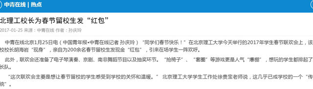 【中青在線】北理工校長為春節留校生發“紅包”