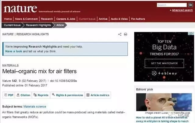 二月初,國際權(quán)威學(xué)術(shù)期刊《自然》刊登了北京理工大學(xué)教授王博及其團(tuán)隊成功將金屬有機(jī)骨架化合物(MOFs)材料應(yīng)用于空氣過濾、凈化與治理等方面的成果。這篇名為《金屬有機(jī)合物在空氣過濾領(lǐng)域的應(yīng)用(Metal–organic mix for air filters)》的論文指出,通過將能夠大規(guī)模生產(chǎn)的MOFs材料薄膜應(yīng)用在空氣過濾裝置中,可有效過濾PM2.5,凈化空氣。經(jīng)過實驗室檢測,在室溫下,該種材料能夠有效地將空氣中的PM2.5和PM10污染物降低99.5%。