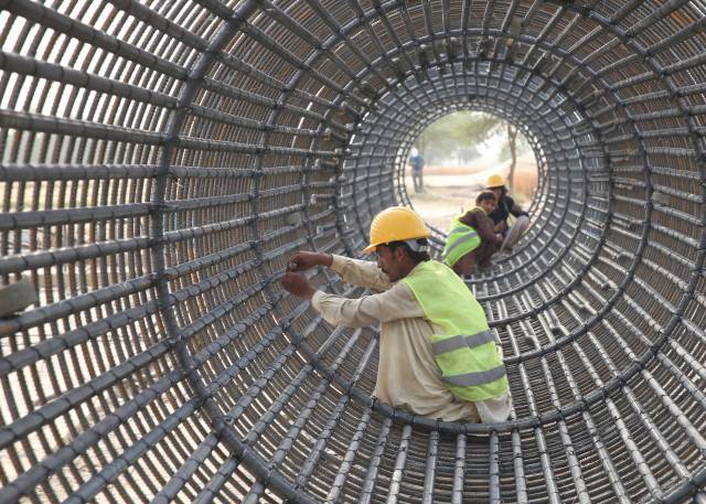 2017年4月21日,在巴基斯坦木爾坦附近,巴基斯坦工人在白沙瓦至卡拉奇高速公路的一處工地施工。由中國建筑股份有限公司承建的白沙瓦至卡拉奇高速公路(木爾坦至蘇庫爾段)全長392公里,是中巴經(jīng)濟走廊最大交通基礎(chǔ)設(shè)施項目。(新華社記者劉天攝)