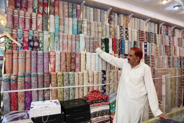 2017年4月2日,在巴基斯坦拉瓦爾品第“中國商城”,一家布匹店的老板展示中國產(chǎn)的布料。拉瓦爾品第“中國商城”是位于巴基斯坦拉瓦爾品第市中心的一條商業(yè)街,已有30多年歷史。這條商業(yè)街內(nèi)有1000多家商鋪銷售中國商品,因此被當?shù)厝朔Q為“中國商城”。(新華社發(fā),艾哈邁德·卡邁勒攝)