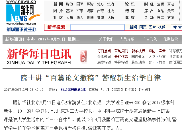 據(jù)新華社北京9月11日電(記者魏夢佳)北京理工大學(xué)近日迎來3800多名2017級本科新生。10日的開學(xué)典禮上,北京理工大學(xué)校長、中國科學(xué)院院士胡海巖給新生上的第一課是講大學(xué)生活中的“三個自律”。他以今年4月我國約百篇論文遭遇撤稿事件為例,警醒學(xué)生們在學(xué)術(shù)道德方面要保持嚴(yán)格自律,做誠實守信之人。