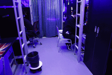 鄧亞東告訴北青報記者,這個創意來自于《星球大戰》,電影中藍光的特效讓他“有一種身居宇宙的感覺”,于是他們把屋子的上游部分裝上了LED燈帶,打開開關時,也能泛起藍光。為了更好地襯托“這道藍光”,他們又在墻壁上貼了黑色環保壁紙,在地上鋪了灰色反光材料的地膠,“讓藍光從天花板到地面再到墻壁遙相呼應”。這樣的設計讓他們的宿舍生活充滿了情調,“就好像把宿舍搬到了宇宙中”。