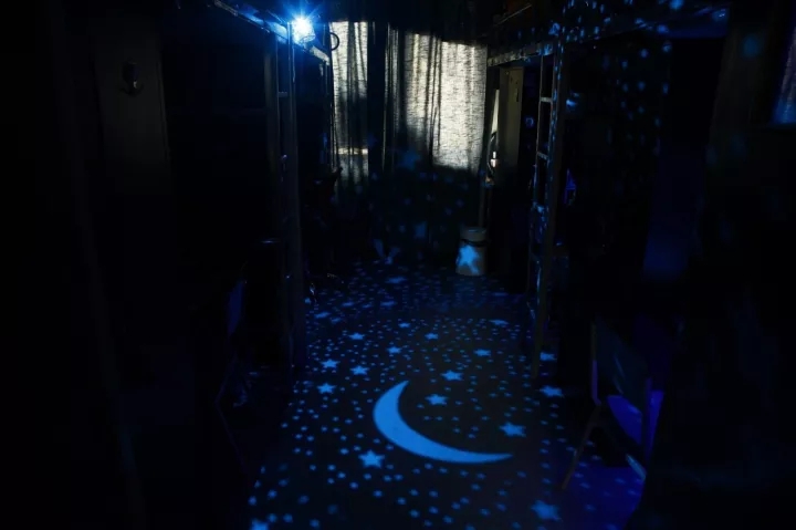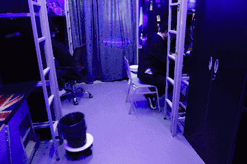 宿舍整體以黑色墻紙和灰色地膠作為大背景,輔以深藍色的霓虹燈,再加上高技術含量的科技產品進行支撐,很有科幻劇的味道。亞東對改造后的宿舍很滿意,他給自己評價為:“SIX! SIX! SIX!”。