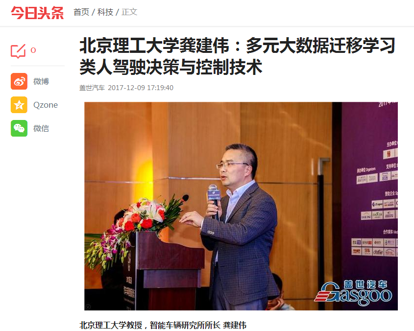 【今日頭條】北京理工大學(xué)龔建偉:多元大數(shù)據(jù)遷移學(xué)習(xí)類人駕駛決策與控制技術(shù)