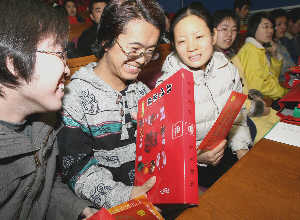 1月20日,北京理工大學500名家庭生活困難學生參加了由學校組織的2006年春節“向學生送溫暖”活動。圖為藏族學生次仁扎西(中)拿著學校發放的2000余元路費,高興得合不攏嘴。本報記者 樊世鋼 攝