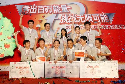 百萬大獎各歸其主的激動時刻終于到來了,由于采取的是從第十名到第一名的倒序頒獎,所以冠軍的懸念將一直到最后才能揭曉。選手們都懷著緊張激動的復雜心情聽著頒獎嘉賓揭曉一個又一個獎項的歸屬。每一支上臺領獎的隊伍除了領取獎杯、獎牌以及趨勢科技預聘書外,隊長還要取下賽前懸掛在夢想蘋果樹上的夢想卡并現場宣讀他們的夢想致辭。已經領過獎的隊伍盡管多少有些不能奪冠的遺憾,但年輕不言敗,況且能從全國三百五十支初賽隊伍中脫穎而出參加決賽本身就是種勝利。而幾天的大賽已讓所有選手結下了深厚的友誼,所以每當有隊伍上臺領獎的時候,臺下都會報以最熱烈最真誠的掌聲。終于當Collapsar隊從梁國屏先生手中捧過冠軍獎杯和二十萬支票的時候,現場熱鬧的氣氛到達了頂峰。場下的選手們有的握手擁抱互留聯系方式,有的激動跳著叫著,全場洋溢著青春活力。