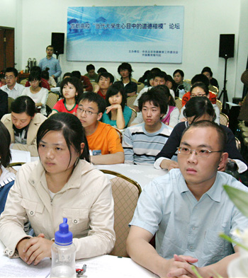 4月25日下午,首都高校“當代大學生心目中的道德楷模”論壇在京舉行。圖為論壇現場。左為一等獎獲得者,我校學生李艷麗。