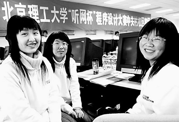 11月17日,北京理工大學軟件學院的鄭韻(左一)、楊柳(左二)和計算機科學技術學院的楊陽(右一)同學組成的團隊在該校舉辦的“聽網杯”程序設計大賽上。