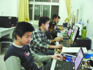 除了上課之外,同學(xué)們都待在工作室,廢寢忘食?!拔覀兠刻煲谶@里耗上十幾個小時?!眲⒀笠贿呎f,一邊不停地用鼠標(biāo)點擊著工作室編的電子書——從第一輯對游戲《仙劍》的模仿,到后來幾輯插圖風(fēng)格的日趨個性化,即使是個外行,也可以看出《盤古OL》的變化和成熟。劉洋說,他們目的很簡單,就是要做中國最好的網(wǎng)游。