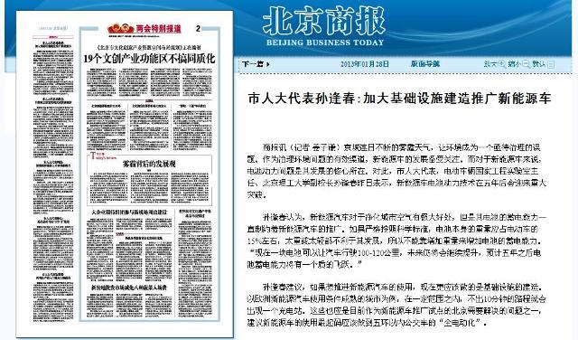 【北京商報】市人大代表孫逢春:加大基礎設施建造推廣新能源車