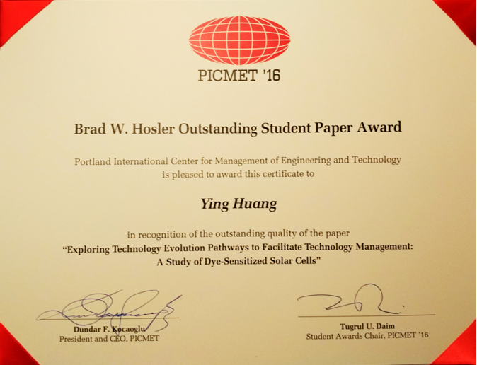 編輯:嚴箐 審核:汪雪鋒 閱讀次數:2016年9月7日,北京理工大學管理與經濟學院知識管理與數據分析實驗室2013級博士生黃穎(導師:朱東華教授)在美國夏威夷舉辦的2016年波特蘭工程與技術管理國際會議(Portland International Center for Management of Engineering and Technology,PICMET 2016)上獲得Brad W. Hosler最佳學生論文獎(Brad W. Hosler Outstanding Student Paper Award),獎金1000美元,這是繼實驗室周瀟博士(導師:朱東華教授)2013年首獲Brad W. Hosler最佳學生論文獎(http://www.b60b.com/xww/xwtt/90436.htm)以來,中國大陸地區學者第二次獲此殊榮。據悉,PICMET 2016國際會議共收到來自37個國家和地區300多個機構的779篇學術論文,經過專家多輪嚴格評審,331篇論文被會議錄用,其中5篇論文獲最佳學生論文獎提名,最終黃穎博士與導師等人合作撰寫的論文 “Exploring Technology Evolution Pathways to Facilitate Technology Management: A Study of Dye-Sensitized Solar Cells”受到評審專家的高度認可,獲得大會唯一的最佳學生論文獎,并受到與會學者的廣泛關注,進一步提升了我校在科技管理與科技政策領域的影響力,為我校贏得廣泛贊譽。此外,北京理工大學—美國佐治亞理工學院—英國曼徹斯特大學技術創新聯合實驗室(BIT-GT-UOM Innovation Co-Laboratory)美方負責人、北京理工大學兼職教授Alan Porter教授榮獲會議頒發的“杰出貢獻獎”(Medal of Excellence)。