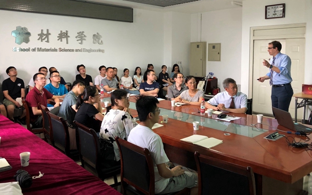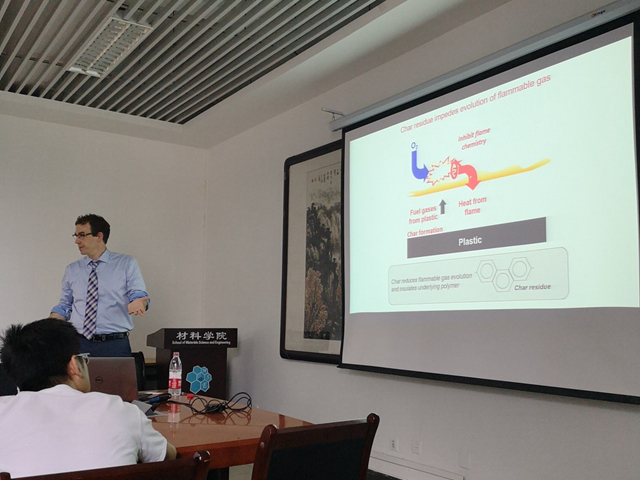 7月25日,麻省大學Amherst校區國家高分子研究中心的Todd Emrick教授來我校材料學院作題為《Reducing Polymer Flammability with New Designer Synthetic Materials》的講座。新型本質阻燃聚合物的合成是Todd Emrick教授課題組的研究方向之一,在不需要添加含鹵阻燃劑或者無機阻燃劑的情況下就可以達到理想的阻燃級別。教授憑借其淵博的專業知識和風趣幽默的講授風格,深入淺出地講述了羥基、環氧基和雙鍵在生物基高聚物中的結合及相應的阻燃效果,吸引了眾多感興趣的師生們,會議室內座無虛席。
