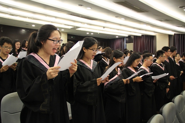 學(xué)院教師汪雅麗老師作為教師代表發(fā)言。她希望同學(xué)們在今后的人生道路上,保持開放的心態(tài),不斷追求改變,讀萬卷書,行萬里路,以謙遜的態(tài)度,勇敢的心智把未來的路越走越寬廣。外國語學(xué)院02級英語專業(yè)本科生、06級英語專業(yè)碩士生、現(xiàn)就職于中國商務(wù)部人事司的毛碩作為杰出校友代表發(fā)言。作為一個過來人,結(jié)合自己的人生感悟,他用了三個關(guān)鍵詞:“享受”、“包容”和“擔當”來寄語學(xué)弟學(xué)妹們,并希望學(xué)弟學(xué)妹們要保持對專業(yè)和事業(yè)的尊重與敬畏,在社會大舞臺上闖出屬于自己的一片天。