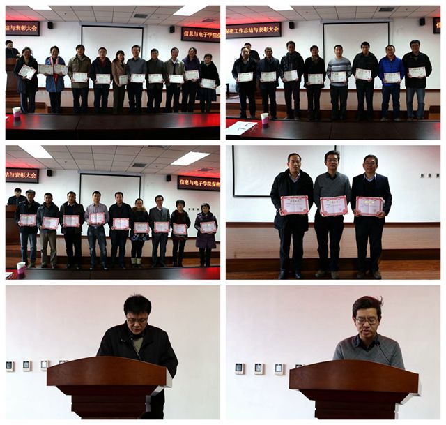 何遵文副院長宣讀了關于表彰保密工作先進個人、先進集體及保密資質認證(復查)工作優秀組織單位的決定,趙顯利副校長、鄭重處長和學院領導分別為受表彰的集體和個人頒發了榮譽證書。陶然教授課題組趙興浩老師和吳嗣亮教授課題組李海老師分別做保密工作經驗交流發言。