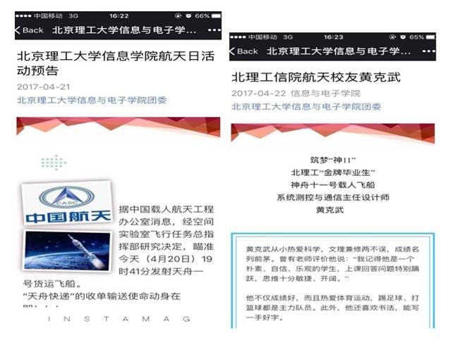 從4月20日開始,北理工信息學院積極開展“航天日宣傳周”活動,為大家講述投身航天的信息人:筑夢“神11”的載人飛船系統測控與通信主任設計師黃克武,學院雷達技術研究所吳嗣亮教授,投身航天事業的微波技術73級校友伍捍東。通過對優秀校友的介紹,希望同學們能以“信息航天人”為榜樣,向他們學習。