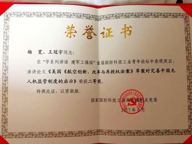 6月6日,國家國防科工局在京舉辦首屆國防科技工業(yè)青年論壇。國防科工局黨組副書記、副局長張克儉出席會議并講話,中共中央組織部、中央國家機關工委、共青團中央、國防科工局,有關省、自治區(qū)、直轄市國防科技工業(yè)管理部門,各軍工集團公司、部門民口單位的領導和300余名青年代表參加了會議。北理工法學院助理研究員楊寬和科學技術研究院王冠宇參加該論壇并做主題報告,由兩人共同撰寫的論文《美國<航空創(chuàng)新、改革與再授權>草案對完善中國無人機監(jiān)管制度的啟示》榮獲論壇二等獎。