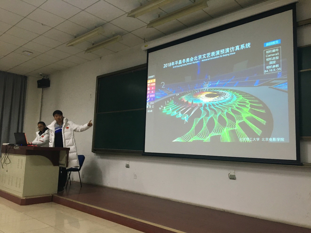 團(tuán)隊(duì)的研究生學(xué)長學(xué)姐分享了自己的感悟,以及發(fā)生在排練現(xiàn)場的精彩故事,講述了團(tuán)隊(duì)成員酸甜苦辣的臺(tái)前幕后。他們表示非常榮幸能夠參與“北京8分鐘”技術(shù)制作的過程,雖然連續(xù)2個(gè)多月持續(xù)低溫作業(yè)很辛苦,但是整個(gè)團(tuán)隊(duì)團(tuán)結(jié)一心、師生同甘共苦,為向全世界展示中國的濃厚文化和快速發(fā)展而付出自己的努力,這種自豪感帶領(lǐng)團(tuán)隊(duì)攻堅(jiān)克難,順利完成了平昌冬奧會(huì)“北京8分鐘”文藝表演的創(chuàng)意編排與仿真技術(shù)保障工作。