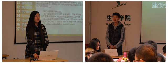 張行健首先進行演講,他結合自己大學生活,從學生工作、興趣愛好、學習、未來計劃等方面分享自己的經歷及感受,強調在大學應把握機會做自己想做的事。董一名隨后發表演講,她的主題是“我的大學”, 對大學獲獎情況、學習情況、社會實踐及業余生活進行介紹,并強調豐富的大學生活使自己獲得成長。