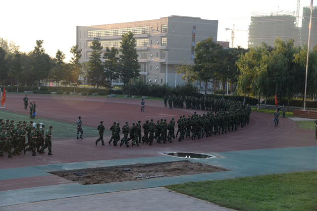 吃過早飯,各連隊在各自的集合地點準備開始一整天的訓練項目。訓練期間,同學們統一著裝、隊列整齊、軍姿颯爽,以最飽滿的熱情全身心地投入到艱苦而又充滿樂趣的軍訓中。“收腹、挺胸、抬頭、目視前方,兩肩向后張。”在教官的提示下,同學們認真調整動作,站軍姿,稍息、立正,每個動作都要嚴格遵守動作要領,做錯或者做慢了迅速打報告改正。在教官高標準、嚴要求的訓練下,稍息立正、停止間轉法、蹲下起立等預定訓練科目已經初見成效。訓練間隙,各個連隊或組織拉歌、或開展游戲、或由同學們表演節目。雖然時間不長,但休息時間已經成為激發同學們訓練熱情的“加油站”;在訓練間隙組織開展一些具有軍營特色的游戲和活動,能夠緩解同學們因長時間訓練而產生的生理和心理疲勞,調動大家的訓練積極性。