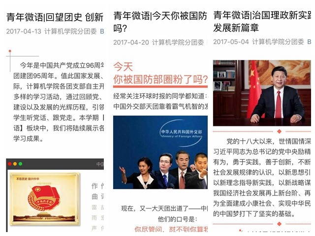 此外,計算機學院結合建團95周年重要時間節點,號召所轄團支部開展了以“學習總書記講話 做合格共青團員”為主題的團日活動。各團支部開展了一系列形式多樣、意義深刻的教育活動:07011606團支部利用課余時間走訪五四新文化運動紀念館,透過一件件文物體會革命前輩們的不屈斗志;07121401團支部以習主席和特朗普的合影為切入點,學習了“習特會”的背景、內容和意義,并討論了習特會將為中國發展帶來的機遇與挑戰,并延伸其到對大學生的影響,由此培養青年團員在日常生活中自發關注時事政治的習慣;2015級碩士第一團支部通過集體觀看紀錄片《少年,你了解中國嗎》,系統回顧了1840年以來中華民族所經歷的痛苦、貧困、饑荒和戰火,結合新中國當下的發展,激發了廣大團員拼搏進取的斗志。