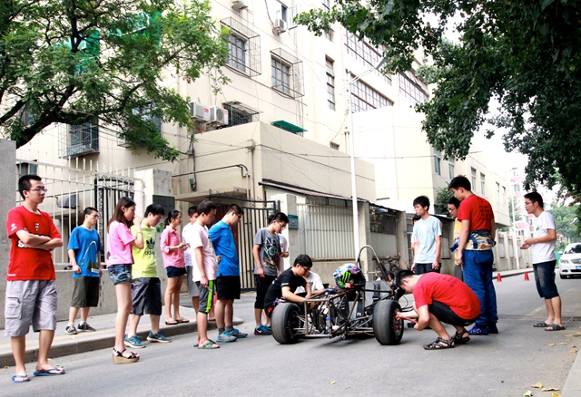 方程式賽車工作室前不久補充了一批實習生,為了做好對實習生的培養,工作室的老隊員們通過“車隊初體驗”、“技術實踐坊”、“制造實戰營”三個環節進行培訓和鍛煉,特別是2010級畢業生隊員們手把手地傳授賽車研發經驗,教設計、教制造、教調試。為保障暑期科技實踐活動的順利開展,工作室運營團隊做好了扎實有效的管理保障,包括安全教育、實習生分組和分配、輪班值日和安全督導等,保證高效有序的實踐過程。在經歷過第一階段的攻堅后,7月23日,本賽季汽油機引擎新車“黑鯊”開始落地試跑,引擎發動的一瞬間,同學們爆發出一陣歡呼。同期,純電動賽車“銀鯊”也在緊鑼密鼓地加工制造中。行百里者半九十,兩輛賽車還須經過兩個月嚴格測試、調試才能達到預期設計目標。